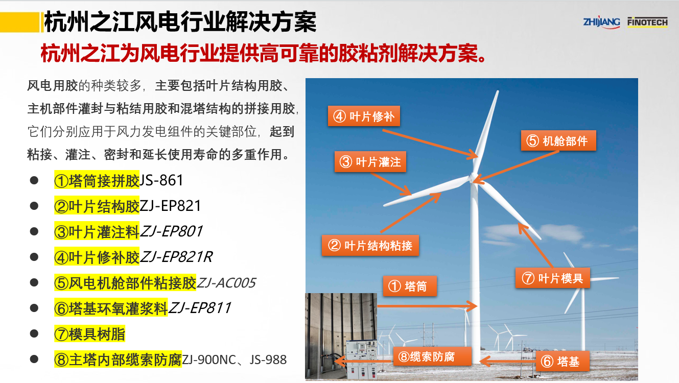 之江公司立足于中國(guó)膠粘劑行業(yè)領(lǐng)軍企業(yè)和有機(jī)硅、聚氨酯、環(huán)氧等專(zhuān)業(yè)膠粘劑的產(chǎn)業(yè)化優(yōu)勢(shì),具有國(guó)家級(jí)高新技術(shù)企業(yè)和國(guó)家級(jí)企業(yè)技術(shù)中心資質(zhì),依靠國(guó)家級(jí)CNAS實(shí)驗(yàn)室以及國(guó)家級(jí)博士后科研工作站,并有國(guó)際專(zhuān)家助力,為風(fēng)電行業(yè)提供高性能的粘結(jié)密封解決方案。其中,關(guān)鍵產(chǎn)品如下: